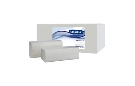 Lapelinis rankšluostinis popierius ClassEur V Extra 2.0, pagamintos iš 100% celiuliozės. Aukštos kokybės higieninio popieriaus gaminys. Itin gerai sugeria drėgmę, tinkamas sąlyčiui su maistu. Patikrinta itališka kokybė.